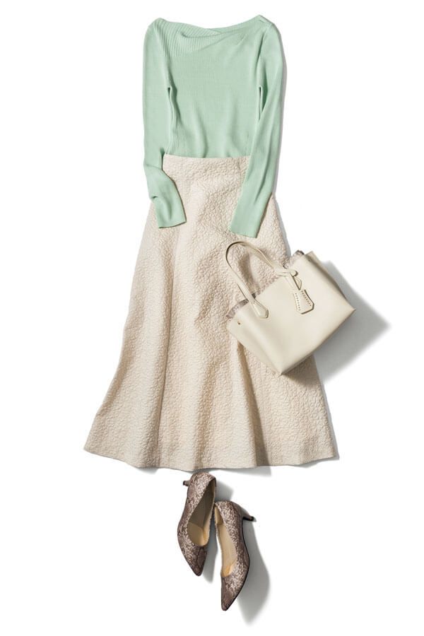 今季はドラマチックで大人っぽいマーメイドタイプに人気が集中。ぽこぽこと表面感のあるジャカードなら白スカートの膨張感を緩和してくれます♪マカロンカラーのニットをインして、すっきりと着こなしつつ、アニマル柄のパンプスで足元にスパイスをひとさじON。