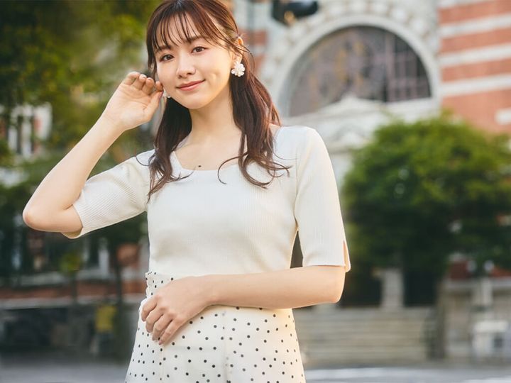 半袖ニットとのアンサンブル×ドットで、春のALLホワイトを旬顔に更新