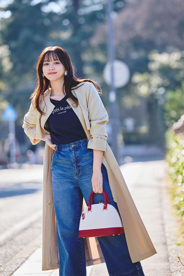 ノーカラーデザインや落ち感のあるシルエット、エレガントなベージュカラーが美人度高めなコート。今年っぽく着こなすなら、ロゴ入りTシャツ×ワイドデニムのカジュアルコンビで、パリっぽくアレンジ♪ 仕上げは赤バッグの色差しで、女性らしいムードと華やぎをON♡