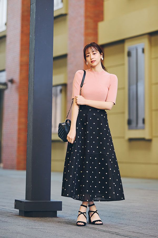 コンパクトニット×フレアスカートのレディ鉄板のワンツーコーデを、明るいオレンジカラーとフラワー刺しゅうで春らしくチアフルにアップデート。ハリのあるスカートのダンボールオーガンジーが、歩くたび、ひらりと揺れて美人見え♡