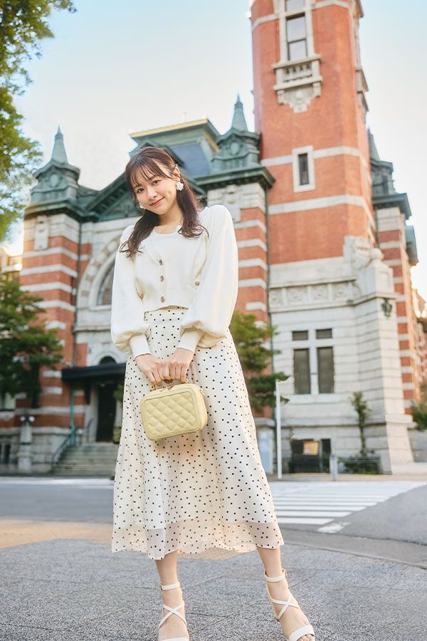 スクエアネック×リブニットとクロップトカーデがセットになった今年らしさ満載のアンサンブルに、シフォンのドットスカートで軽やかさと可愛らしさをトッピング。イエローカラーのスクエアバッグで白×白コーデにキャッチーな奥行きを添えて。