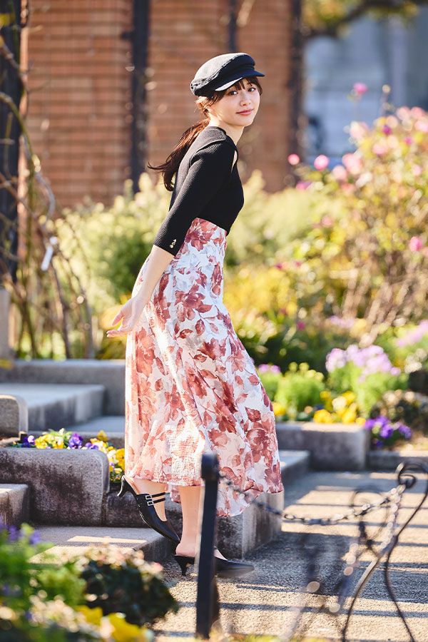濃淡をつけたダイナミックな花柄が目を引くフレアスカートに、リブニットを合わせた王道フェミニンなスタイリング。肩のカットアウトが今年らしいこなれ感をプラス。スカートのウエスト部分がビスチェ切り替えになっていて、きれいなAラインシルエットを作ってくれます。