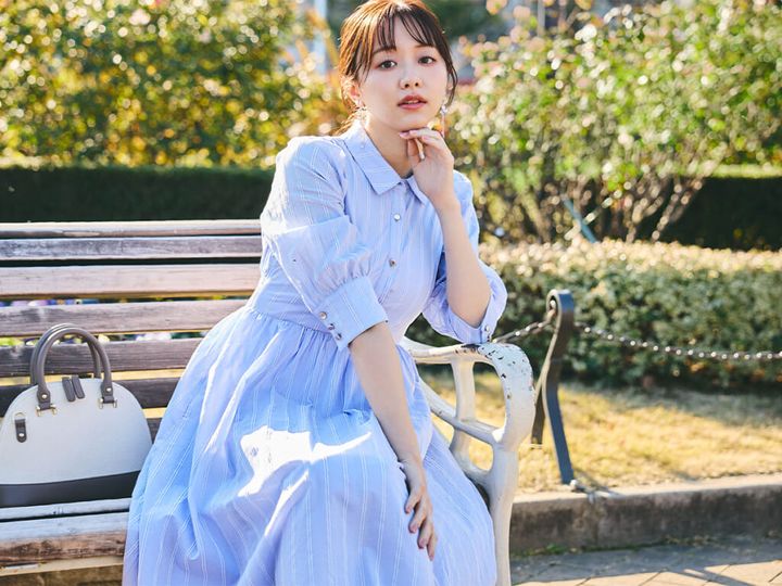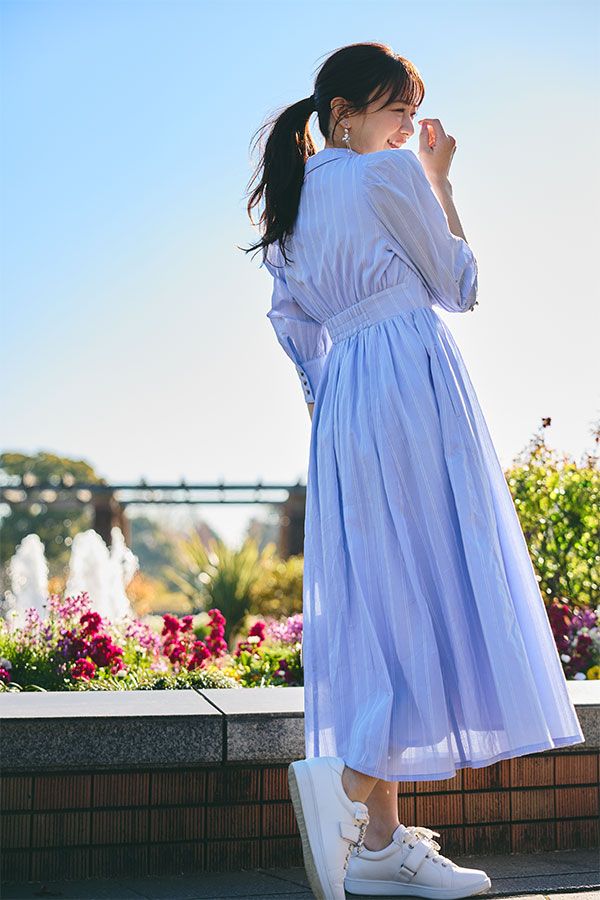 清潔感溢れるブルーストライプのシャツワンピース。ウエストの切り替えからふわっと広がるフレアなヘムがドラマチック。顔まわりにフェミニンな印象を与えてくれる小ぶりな襟元やパフスリーブもポイント。あえて足元はスニーカーでハズして都会的に。