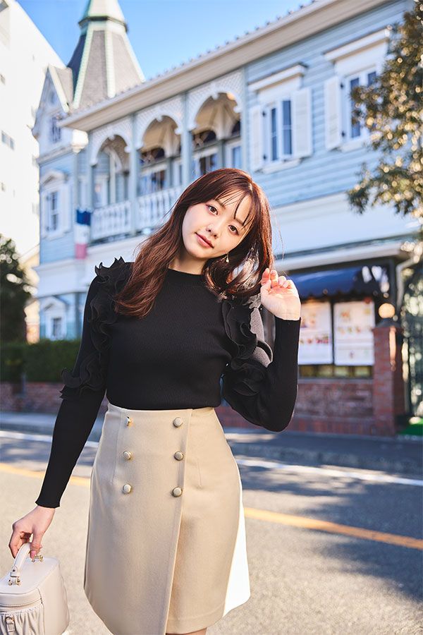 ハイウエストのミニスカに、コンパクトニットをすっきりとINしたメリハリのあるスタイリング。ニットに贅沢なフリルがついていて着映え感抜群。ラップデザインやフロントのボタン使いがおしゃれなミニは、うれしいパンツ型の裏地付き。