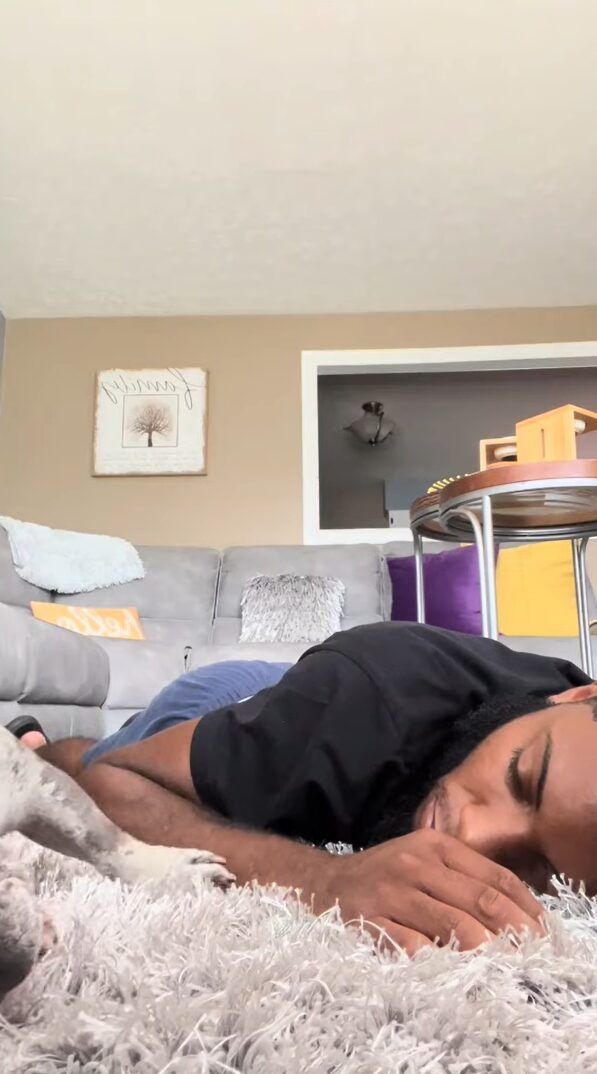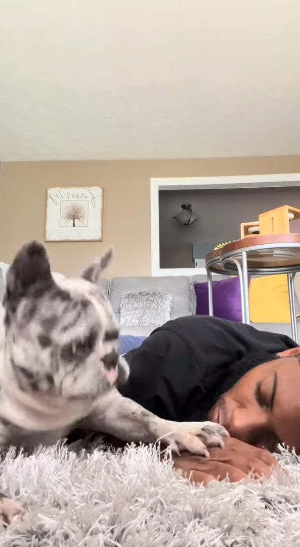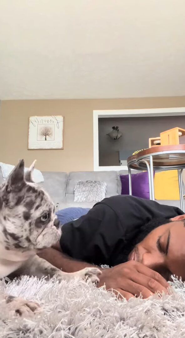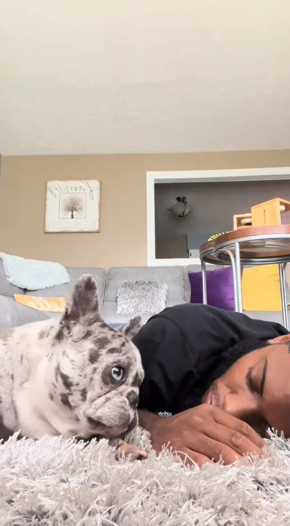 動画が撮影されたのは、アメリカのとあるお宅。 フレンチブルドッグがパパさんと一緒にお昼寝する時の様子が捉えられています。