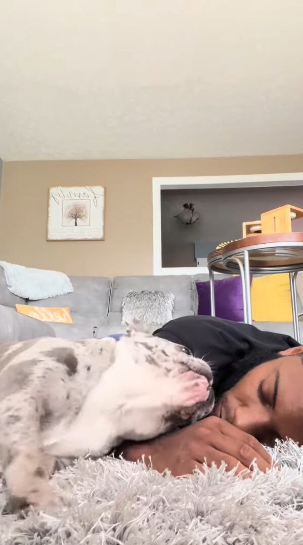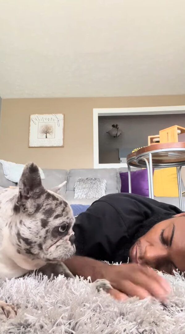 ラグの上で横になって、スヤスヤ眠るパパさんの隣にぴったりとくっついたブルドッグ。 しかし、パパさんのいびきが気になって眠れないようです。