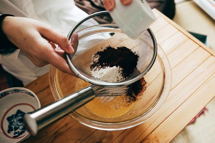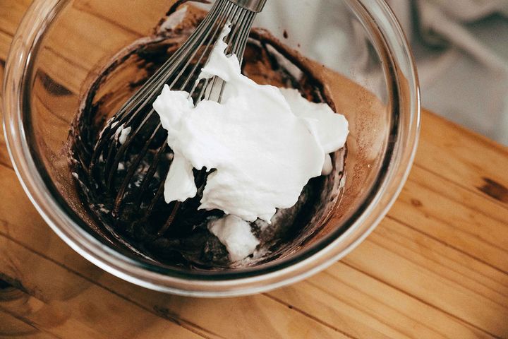 薄力粉とココアパウダーを合わせてにふるい入れます。ここの混ぜ方は少しだけ丁寧に。一気に早くかき混ぜてしまうとぼふっと粉が舞ってしまうので、泡立て器で生地を底から掬うように混ぜていくのがおすすめです。