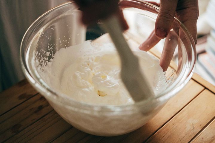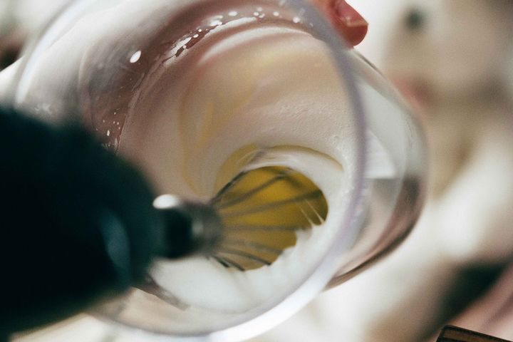 全体が白くふんわりしてきたら残りのグラニュー糖を3回に分けて入れ、すっと角がたつまで混ぜていきます。この手加減がめちゃくちゃ難しい...。生クリームのような柔らかさよりも、ちょっともちっとするまで混ぜることを意識しています。