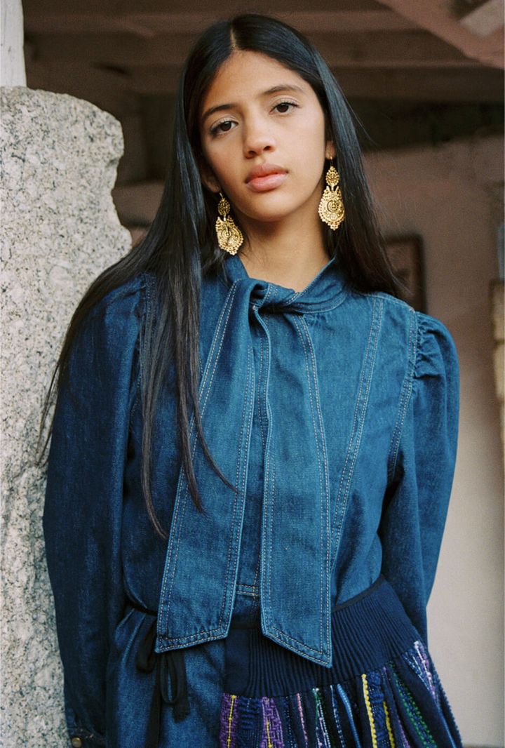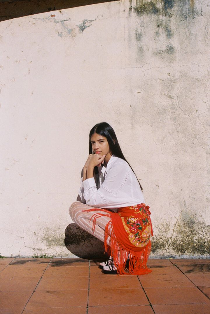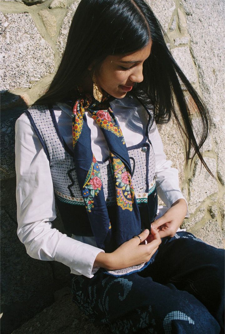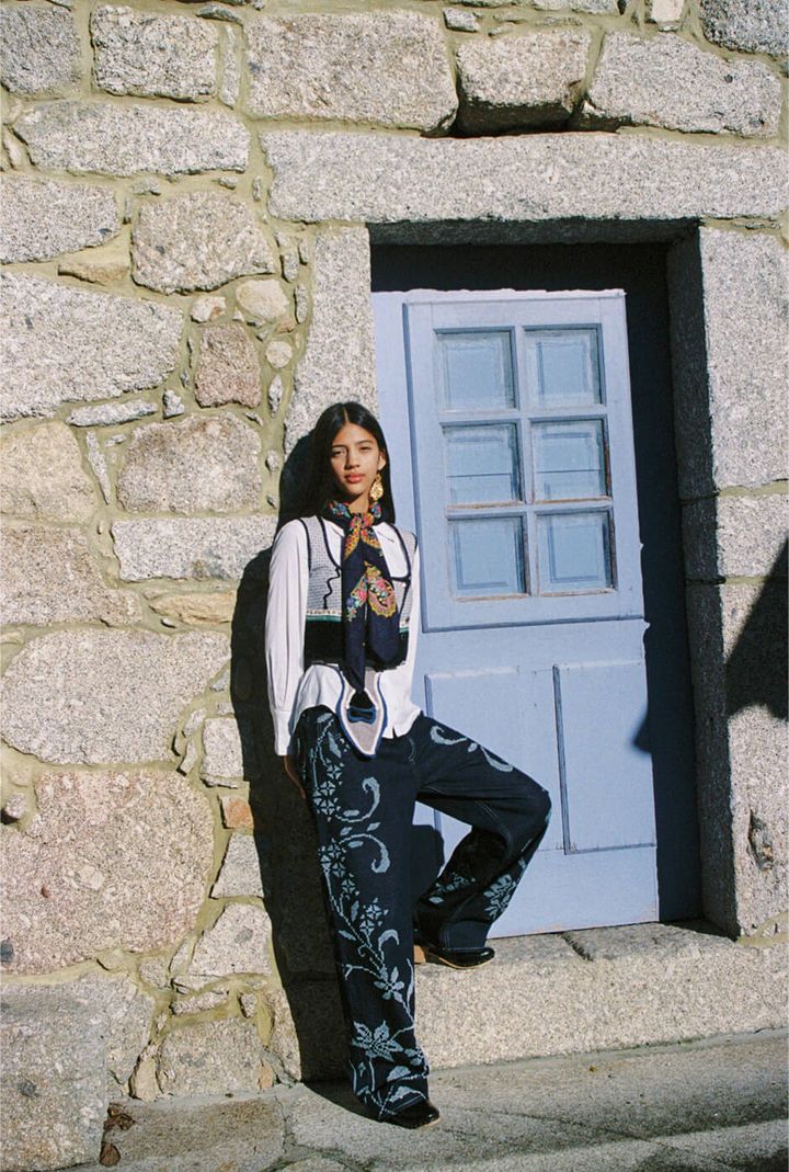 trousers by DIOGO RODRIGUES, top, shoes, scarf and pouch by ARCHIVAL REGIONAL COSTUME, shirt, earrings and ring stylist’s own