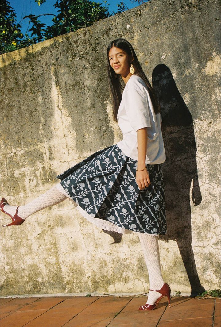 top and skirt by DIOGO RODRIGUES, inner skirt by ARCHIVAL REGIONAL COSTUME, tights, sandals, earrings,necklace and bracelet stylist’s own