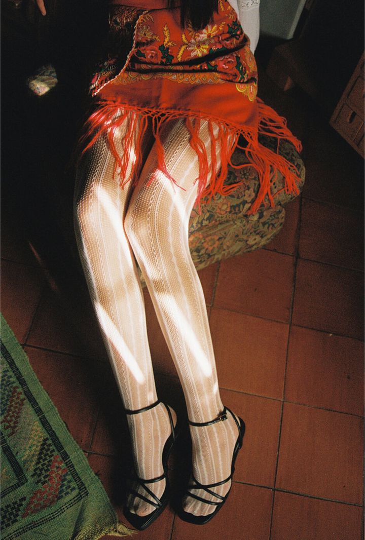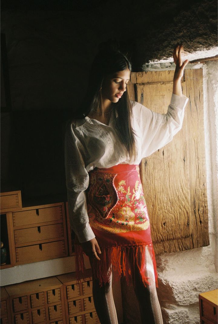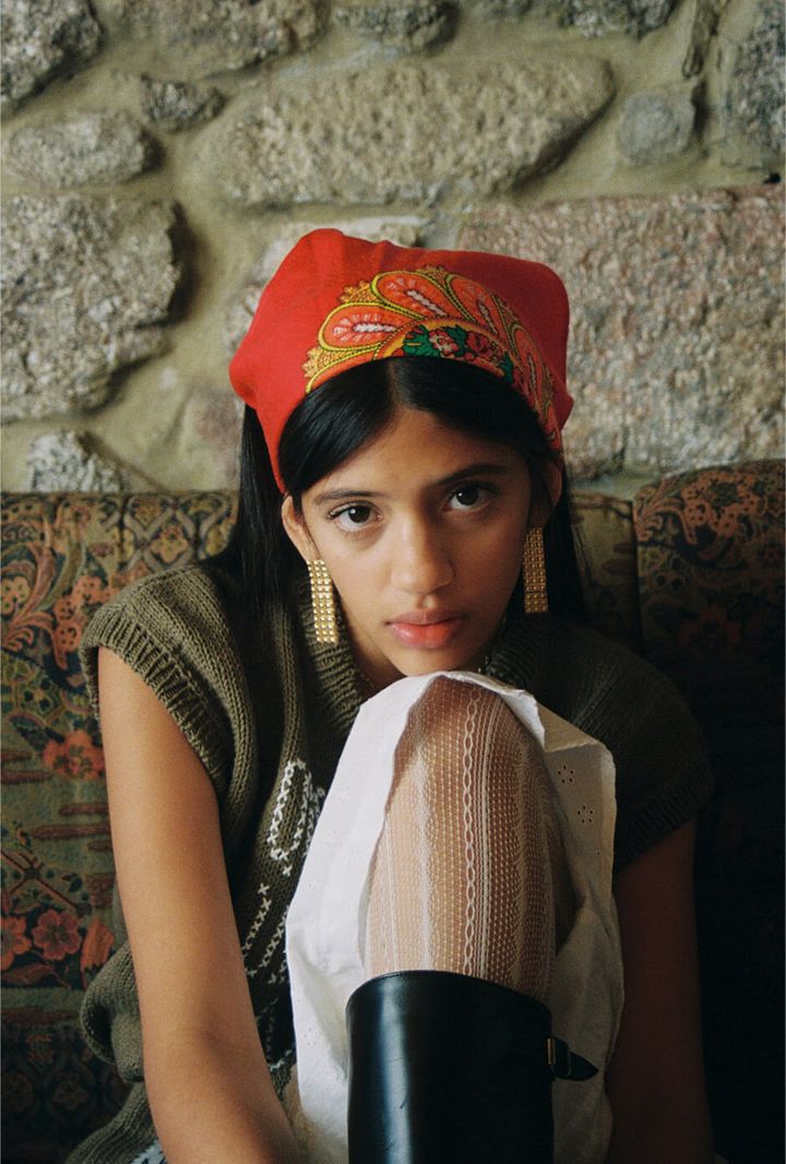 top by DIOGO RODRIGUES, scarf by ARCHIVAL REGIONAL COSTUME, skirt, tights, boots and earrings stylist’s own