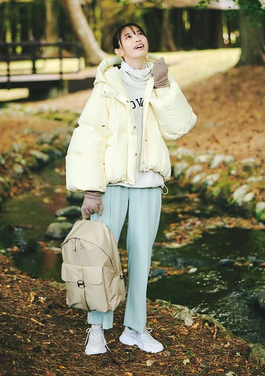 ダウンジャケット¥35,200/FRAY I.D ルミネ新宿2店、ハイネックスウェット¥2,790/アメリカンホリック、カラーパンツ¥6,589/VIS、リュックサック¥6,590/ZARA(ザラ)、スニーカー¥8,800/ORTR(ダブルエー)、手袋¥1,490/GU、2wayイヤカフ¥14,300/ココシュニック オンキッチュ(ココシュニック)