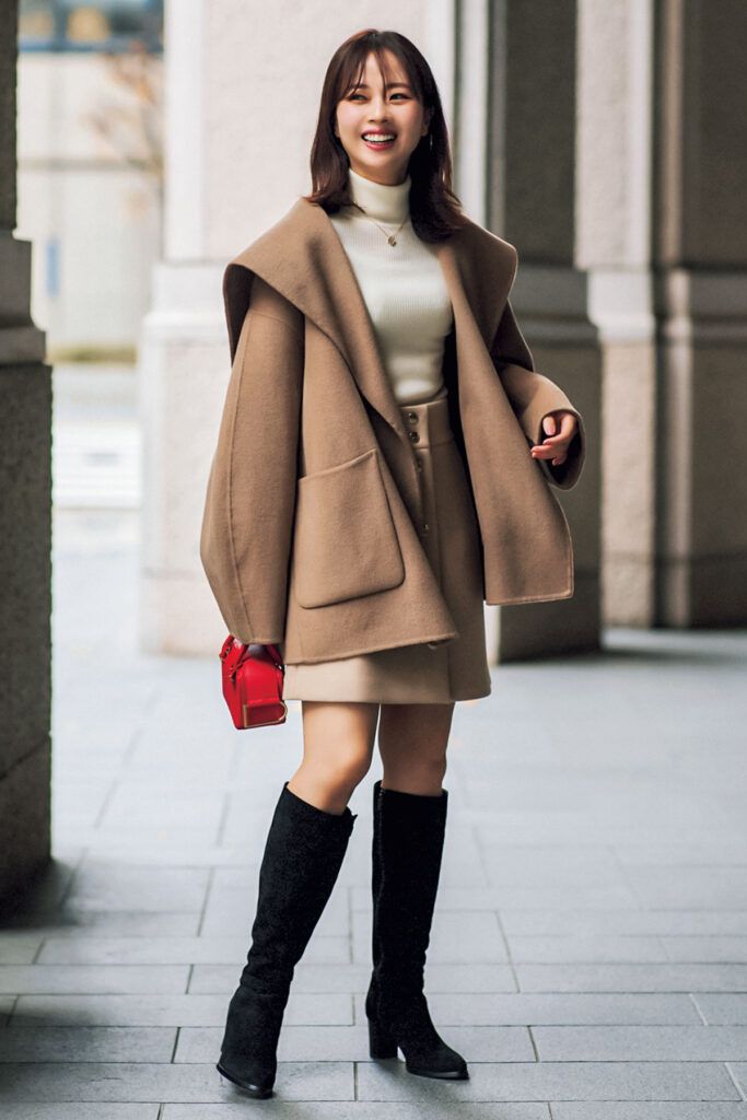 ベージュをフレッシュに見せてくれる真っ赤なバッグを差し色に投入。ショールカラーのショートコートにタートルの合わせはリッチに見える反面、地味見えしてしまうためミニスカ合わせで抜け感を演出します。
