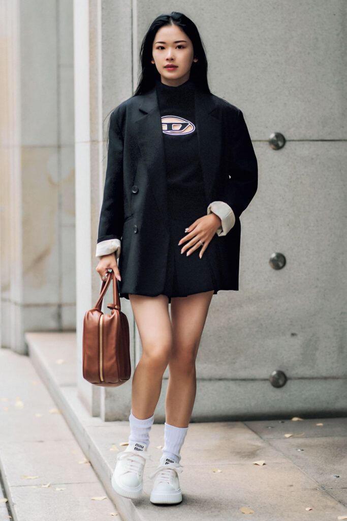 海外セレブの着こなしをお手本にすることが多いのですが、私的ミニの攻略法は、スカートまで覆ってくれるメンズライクなオーバーサイズジャケット。中に着たニットには白Tをレイヤードすることで、ミニの存在感を際立たせることができます。