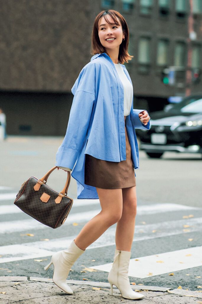 春らしさを色で取り入れたいのなら、失敗なくオシャレに見えるブルー×ブラウンがおすすめ。オーバーサイズのシャツですが、前見ごろが短めなので収まりよく着ることができます。ブーツやTシャツを白に揃えてメインの配色を際立たせるのもポイントです。