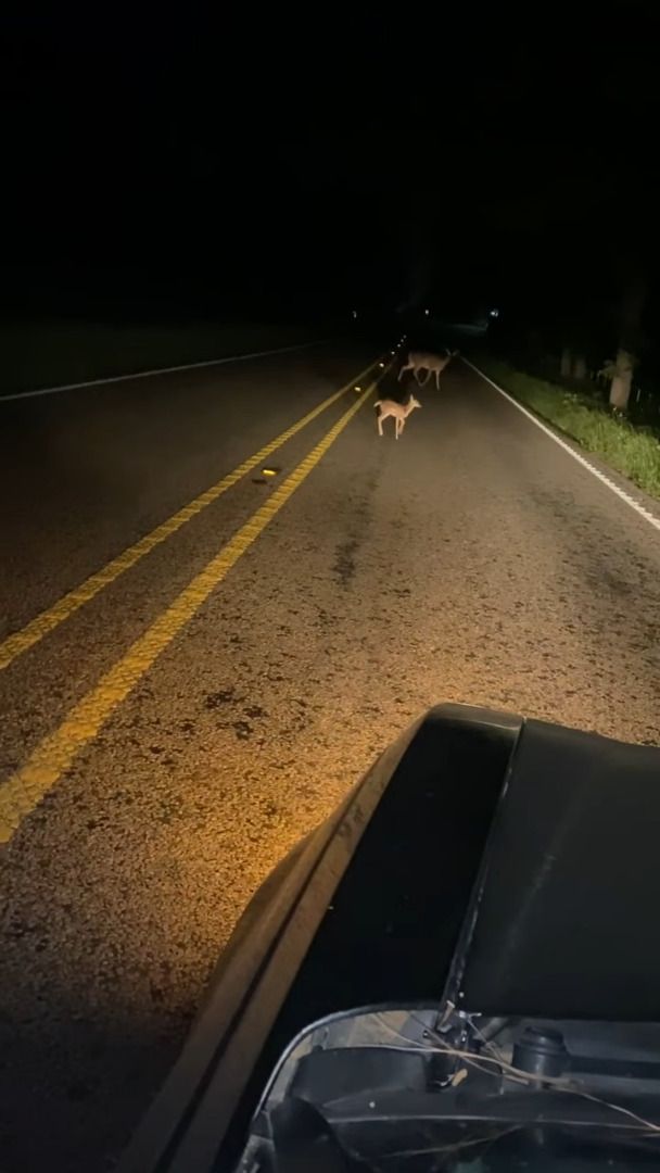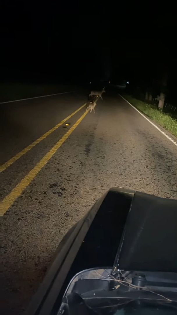 夜道を走行していたドライバーの男性は、前方になにかの姿を発見します。 街灯がないため暗くてよく見えませんが、どうやら鹿の親子のようです。