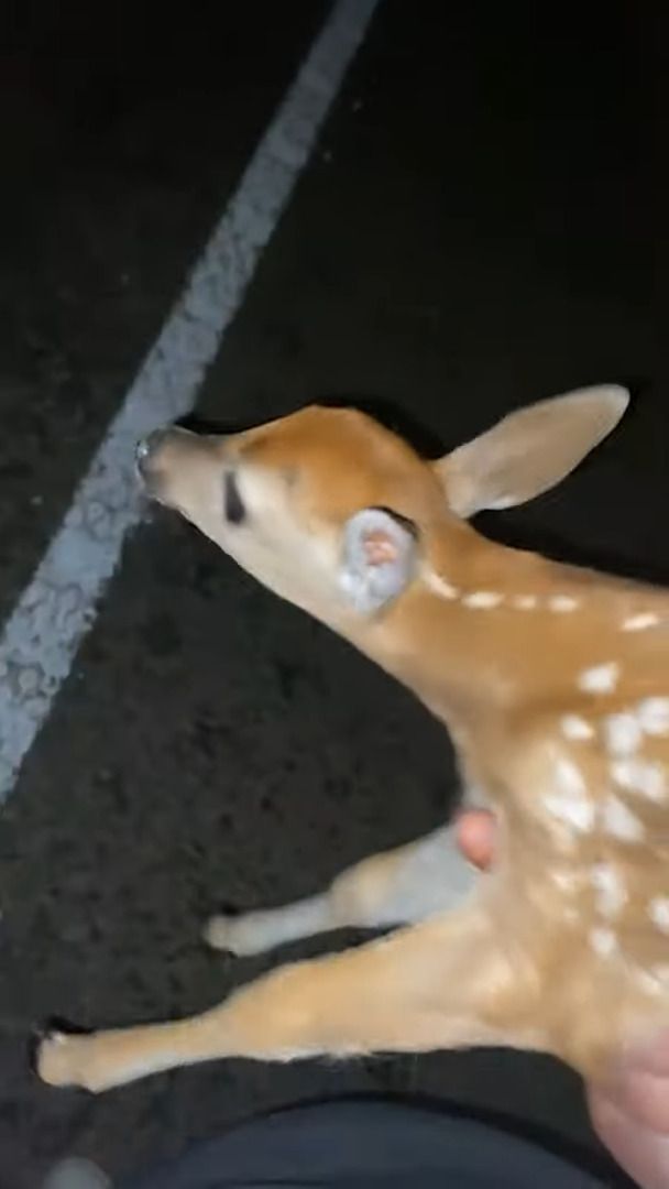 これにはドライバーの男性も焦ったことでしょう。 車から降りて子ジカを抱きかかえると、母シカのもとに送り届けてあげようとするのでした。