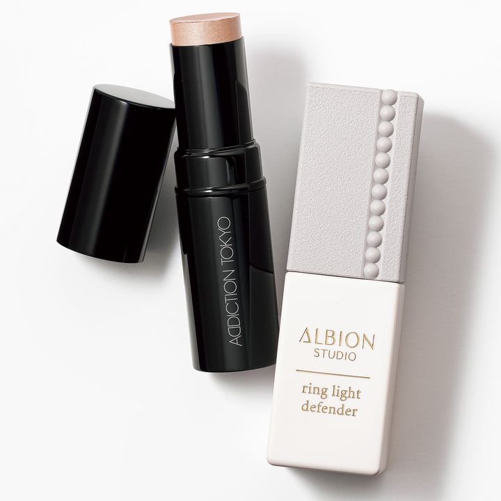 左:[肌馴染みの良いハイライター] 超微細なパールで柔らかいツヤをオン。肌に馴染むピンクベージュ。アディクションザグロウスティック Above the Moon ¥4,180 (ADDICTION BEAUTY)右:[光で明るい肌に導くツヤ系下地] みずみずしいツヤを仕込み、高輝度な光で影やくすみをオフ。アルビオンスタジオリングライトディフェンダー SPF35・ PA+++ 30ml¥3,850〈2月18日発売〉(アルビオン)