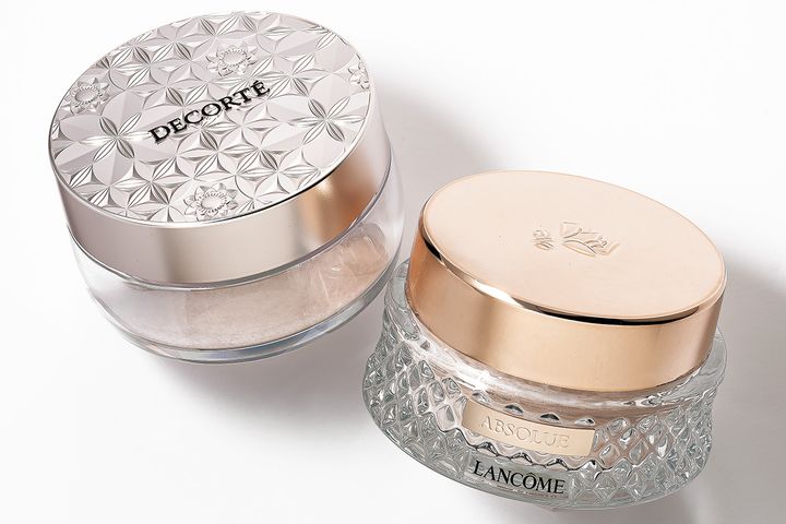 左:人気作が進化!光の反射、透過、散乱を自由に操り悩みをカバー。全9種からノーカラータイプを使用。ルースパウダー 00 20g ¥6,050 ※パフ付き(コスメデコルテ)右:独自技術によりスキン ケア成分を約30%配合。 毛穴や小ジワなどもフィル ターをかけたように補整。 アプソリュ エッセンス イン パウダー 01 15g ¥15,400 (ランコム)