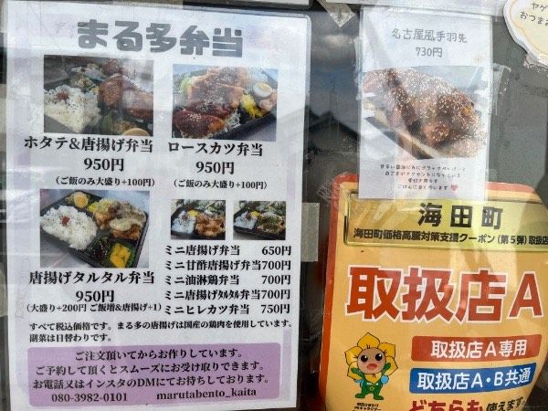 広島県安芸郡海田町寺迫にある「まる多弁当」 海田市駅より徒歩でおよそ30分の場所にあります。 大分生まれの店主さんが、こだわり抜いた大分の唐揚げ、とり天を作られています。 イベント会場等にもよく出店されているので、お店の名前をご存知の方も多いでしょうか。 こちらは、テイクアウト専門店です。