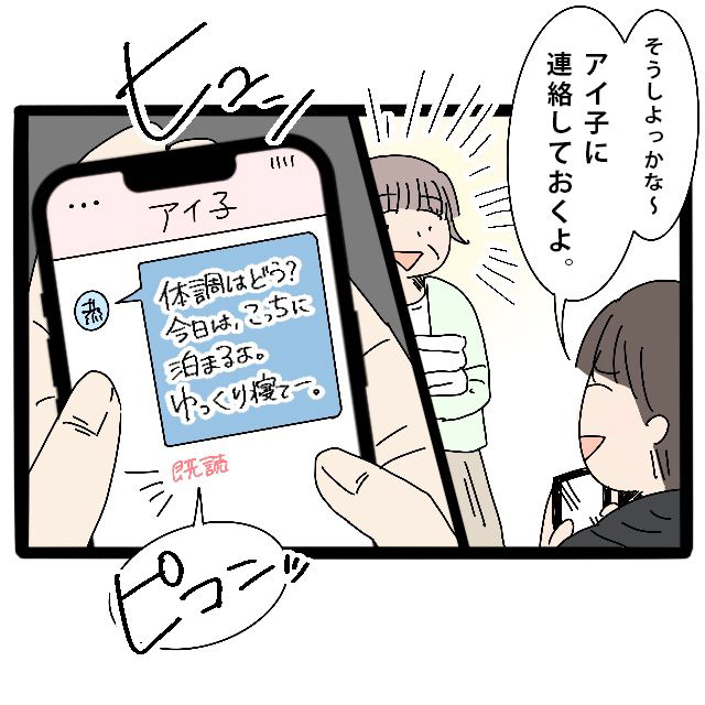 「体調はどう?今日はこっちに泊まるよ。ゆっくり寝てー」