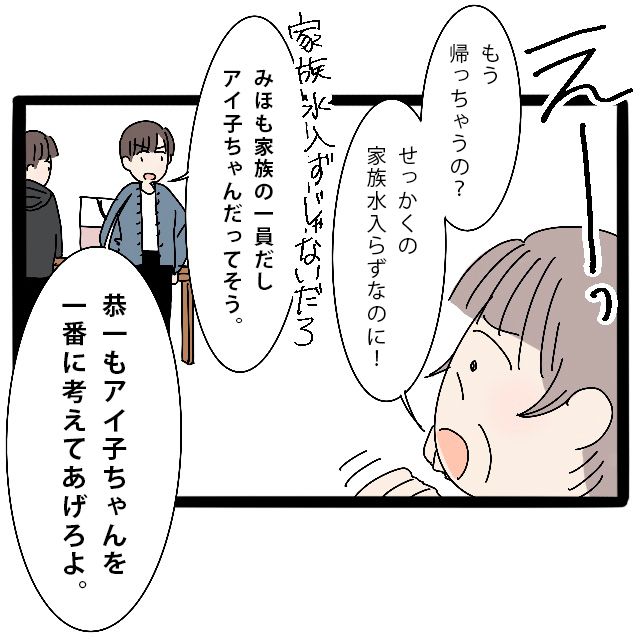 「家族水入らず、じゃないだろ。みほも家族の一員だし、アイ子ちゃんだってそう」