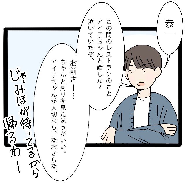「恭一、この間のレストランのこと、アイ子ちゃんと話した?泣いてたぞ。