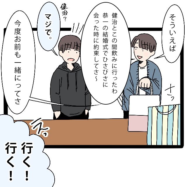 「そういえば、健治とこの間飲みに行ったわ。恭一の結婚式で久々に会った時に約束してさ~」