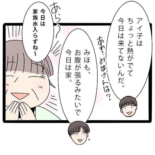 「アイ子はちょっと熱が出て、今日は来てないんだ。あれ?みほさんは?」