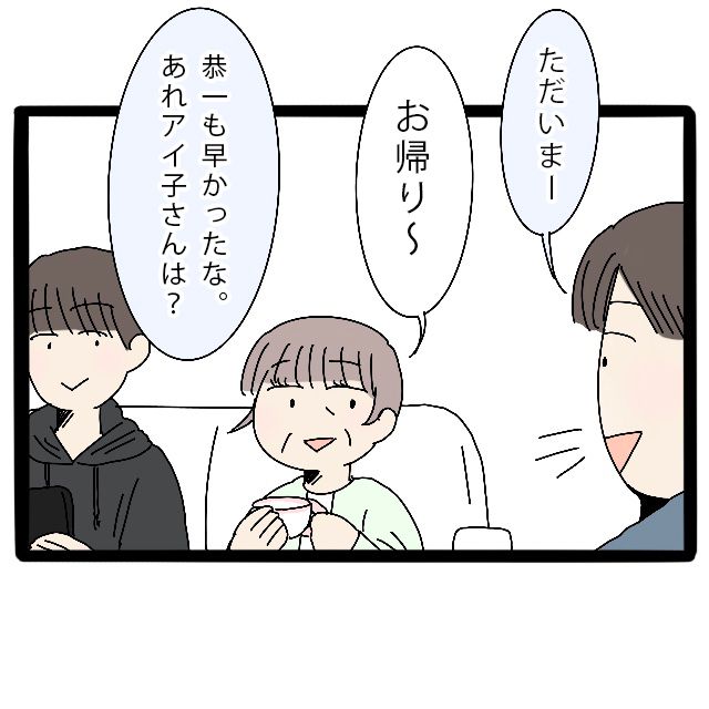 実家に帰った恭一さん、「あらアイ子さんは?」と義母がたずねるもなんだかちょっぴりうれしそうで・・。お土産にと買ってきたケーキを置こうとキッチンに入った恭一さんはコンロの上の鍋を覗き込み、味見しようとしたところ・・「しょっぱ!!なんだよこれ!」あまりのひどい味に驚きましたが「母さんが失敗しちゃったけど、僕が気づいてよかった。誰かが飲んだら大変だ」とやっぱり義母を信じて疑わないのでした・・。