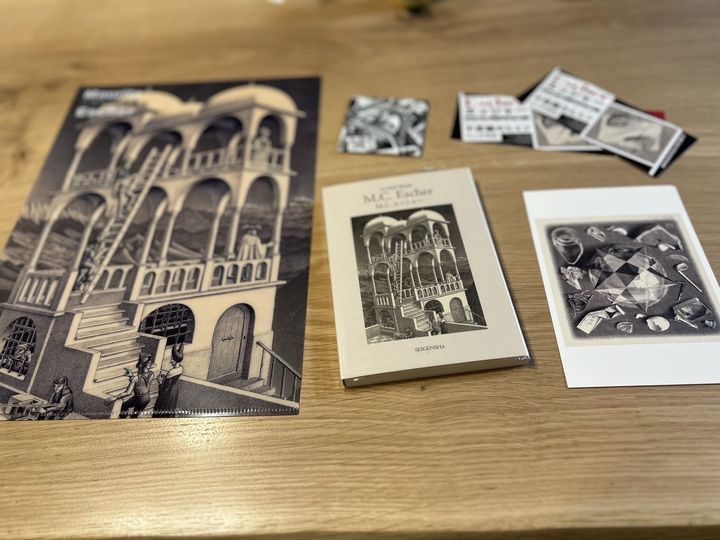 「エッシャー 不思議のヒミツ展」ポストカードやファイルなどのグッズもスタイリッシュです。