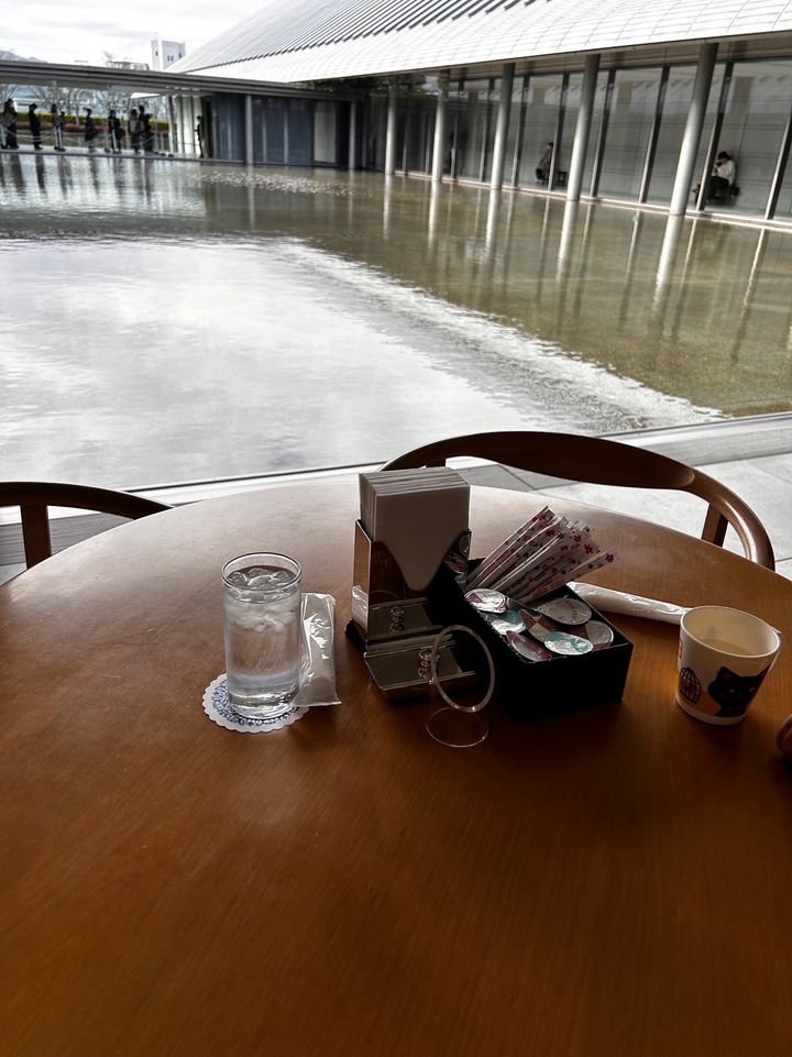 佐川美術館の敷地の大部分を占める水庭を眺めながら優雅にティータイムができます。