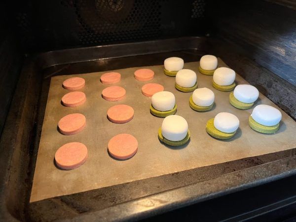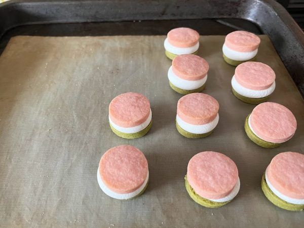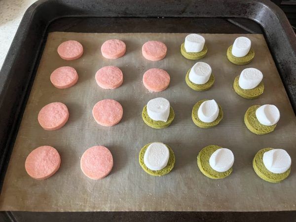 3.焼きあがったら抹茶クッキーをひっくり返し、マシュマロを乗せ、さらに1~2分追加で焼きます
