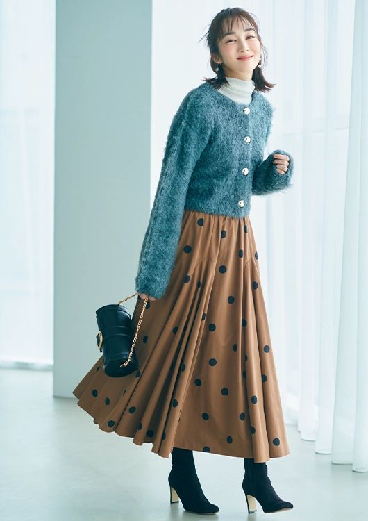 カーディガン¥9,460/PROPORTION BODY DRESSING ニット¥14,300/Stola. スカート¥24,200/マイストラーダイヤ リング¥2,640/アネモネ(サンポークリエイト) バッグ¥19,250、靴¥27,500/ともにダイアナ(ダイアナ 銀座本店)