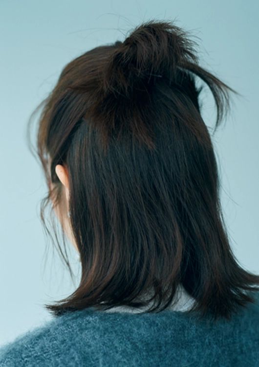 下を向いたときにちらっと見えるくらいの高さでお団子を作ると、カジュアルすぎず大人見え。毛先はあえて散らすのが旬ポイント。顔周りの毛はゆるっとルーズに巻きましょう。