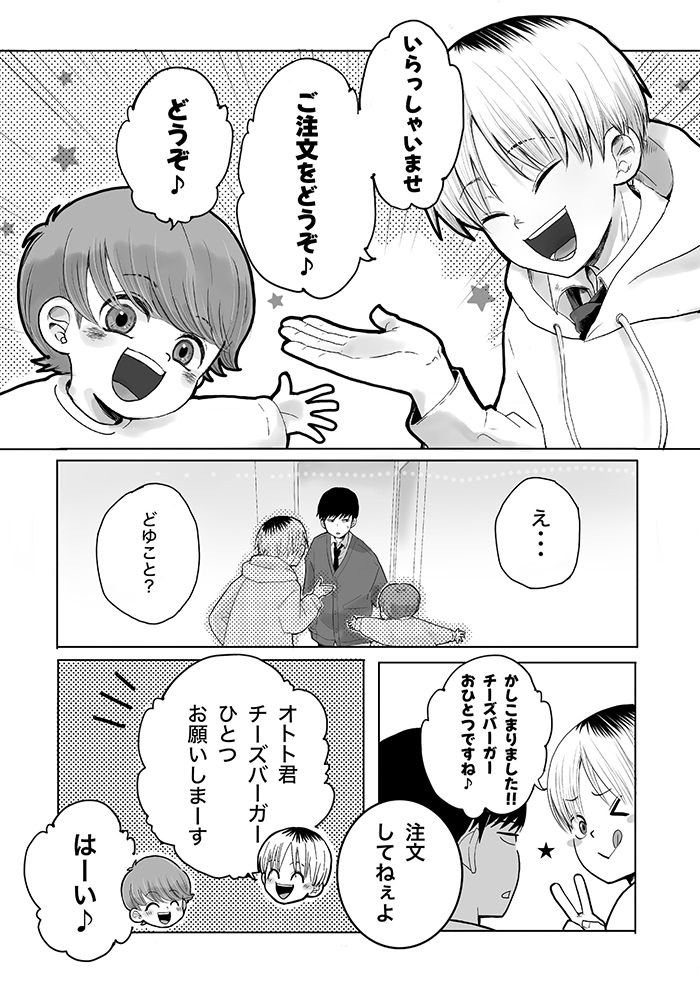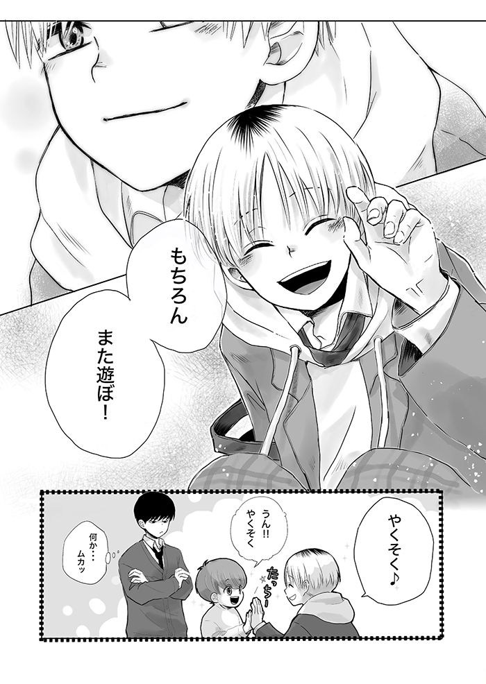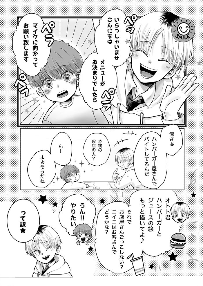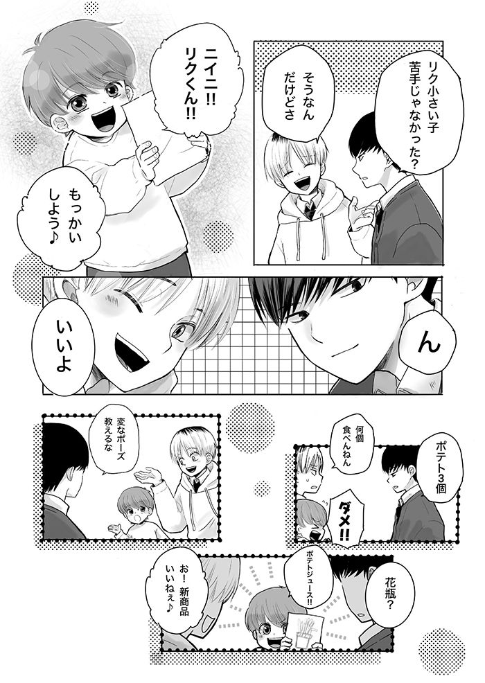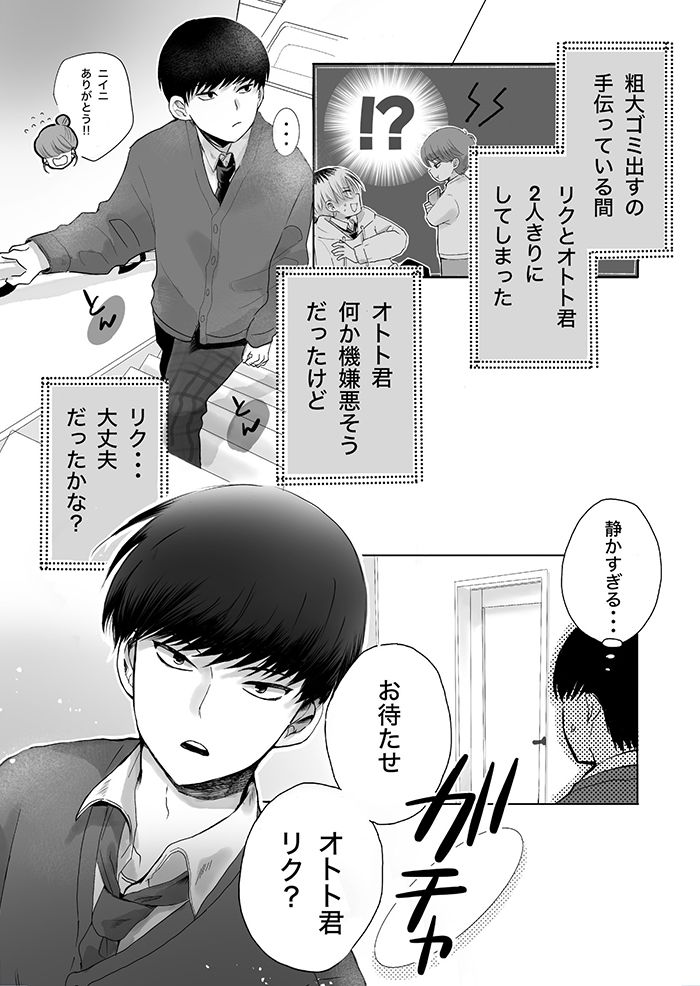 10歳差兄弟のニイニとオトト君。16歳のニイニは弟思いの優しいお兄ちゃんだけど、思春期まっただなかの高校生でもあり……。前回は、ニイニの友だち・リクくんが家に遊びに来たお話。子どもが苦手と言っていたリクでしたが、オトト君と部屋に二人きりの状況に。さあ、どうする……?