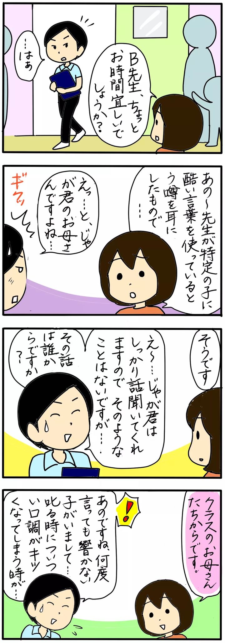 やはり言葉の暴力は見過ごせない。じゃがさんは学校に行った時に、去年B先生が担任だった子を持つ先輩ママにも話を聞いてみました。