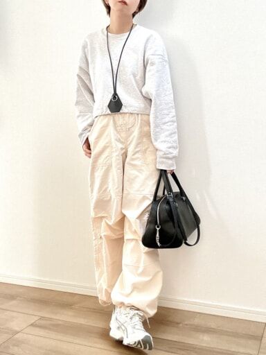 パンツはボリューム感があるので、トップスは旬なショート丈でコンパクトにまとめるのがおすすめ。全体的にカジュアルなアイテム合わせなので、レザーなどのかっちり感のある小物合わせやメイクで大人感を意識するのがポイントです。