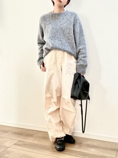 まだまだ絶賛大活躍中の旬なグレーニットに、淡いオレンジのパラシュートパンツを投入すれば、春らしさを先取りしたコーデを楽しめます。