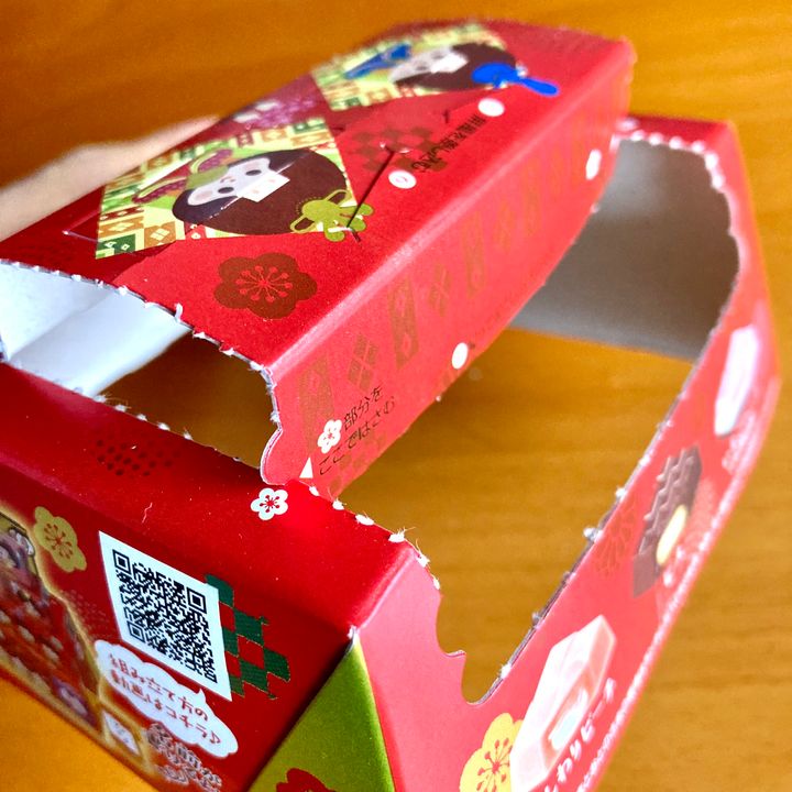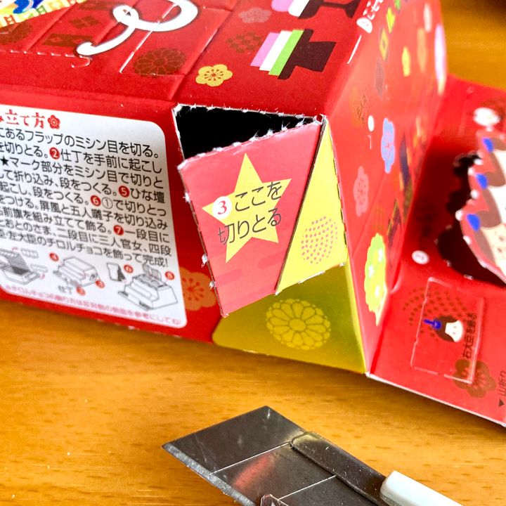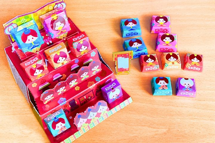 外箱に切り目が入っているから、ハサミなどの道具はいりません。指でプチプチ切り離し、折って、ひな人形のイラストが描かれたチロルチョコを飾ればOK。上から一段目には、お雛様&お内裏様、上から二段目には三人官女、上から三段目には五人囃子、上から四段目には右大臣・左大臣、上から五段目には仕丁(しちょう)が座る、立派な五段飾りが出現します。