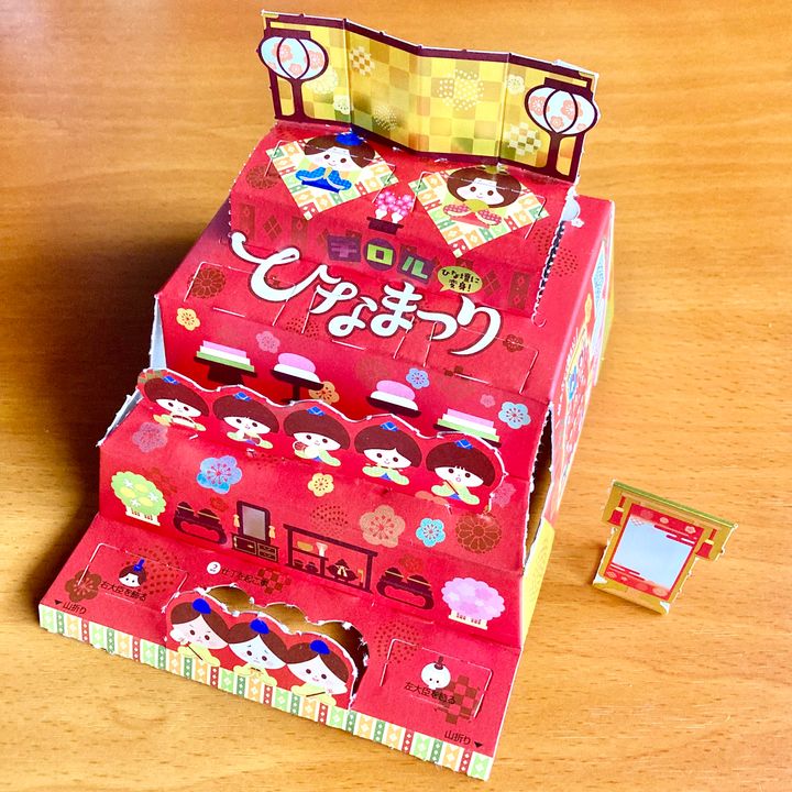 ひな祭りが近づくこの時期、スーパーやコンビニで「ビッグチロル〈ひなまつり〉」が手に入るのをご存じですか?この商品、最大の特徴は、チロルの箱が5段飾りに変身して飾れるということ!