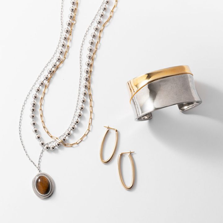 「ゴールドとシルバーをMIXすると、アクセサリー自体の存在感が増します。またネックレスをレイヤードして首元に華やかさを足すときは、素材やモチーフ、長さが違うものを組合せるのがコツ」(スタイリスト平沼さん)