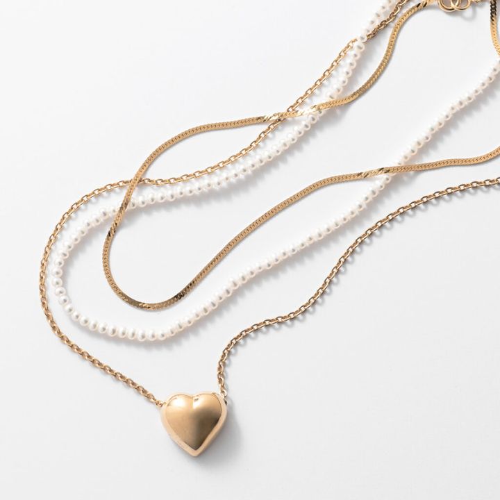 「キャッチーなハートを主役にしたレイヤード。ハートが幼く見えないように、パールで品のよさを足しています。細いスネークチェーンは主役を引き立ててくれる名脇役として、かなりいい仕事をしてくれます!」(スタイリスト平沼さん)