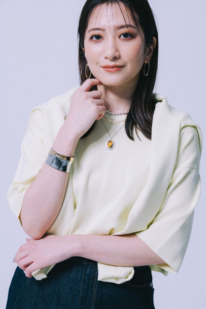 会社員時代は“アナウンサーとしてどう見られるべきか”を意識しながら、洋服を選んでいました。仕事では清潔感があって、露出が少なくて、誰に対しても好印象を与えるものがマスト。それに伴って、私服もシンプルなアイテムが多いです。小物も派手なものは身につけることはなかったので、アクセサリーも華奢でシンプルなものがメイン。アクセサリーで遊んだコーディネート、チャレンジしてみたいです!