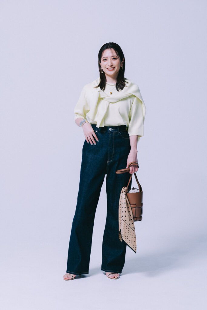 半袖ニット¥34,100肩に掛けたニット¥36,300(ともにエブール フォー ロンハーマン/ロンハーマン)デニムパンツ¥26,400(ヤヌーク/カイタックインターナショナル)バッグ¥46,200(オルセット/オルサ)サンダル¥59,400(ネブローニ)バッグに付けたスカーフ¥15,400(マニプリ)ピアス¥31,900ボールチェーンネックレス¥31,900ゴールドネックレス¥13,200ストーンネックレス¥60,500(すべてマリハ)バングル¥19,800(イン ムード/フォーティーン ショールーム)