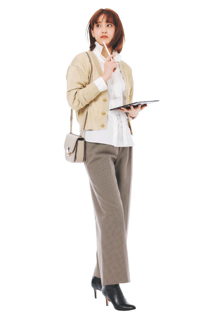 ラメカーデ着回し フリルブラウス¥29,700(マルティニーク/マルティニーク ルミネ横浜)チェック柄セットアップジャケット¥24,200パンツ¥12,980(ともにオリヒカ/オリヒカ池袋東口店)バッグ¥159,500(ボナベンチュラ)ブーツ¥89,100(ペリーコ/アマン)