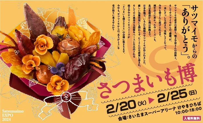 さいたまスーパーアリーナ けやきひろばでは2024年2月20日(火)~2024年2月25日(日)の期間で、「さつまいも博」が開催されます。今年で4回目の開催となるこのイベントは、サツマイモを中心に、作り手と売り手と買い手が一堂に会するサツマイモの一大博覧会です。