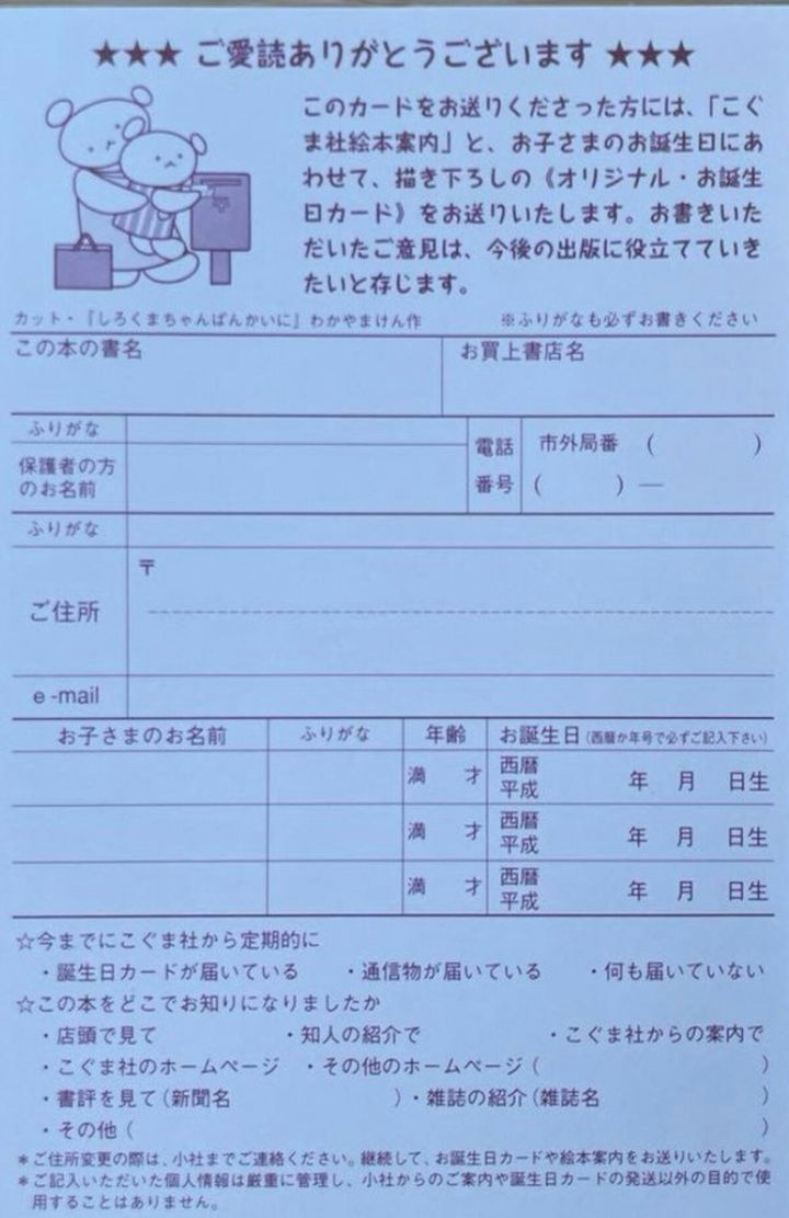 こぐま社の絵本に入っているカードを出すと10歳までバースデーカードが家に届くという親子でハッピーなサービスがあるよ!!