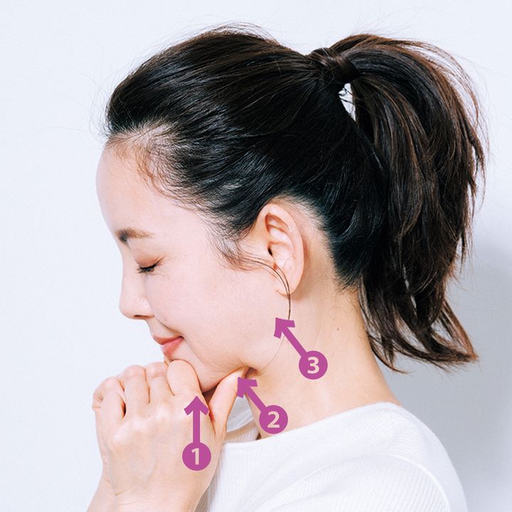オイルをつけ両手の親指と人さし指で顎の中心にある骨をつかみます。頭を前に傾け耳の前まで3段階に左右に指をずらして、 3回ずつ圧を。