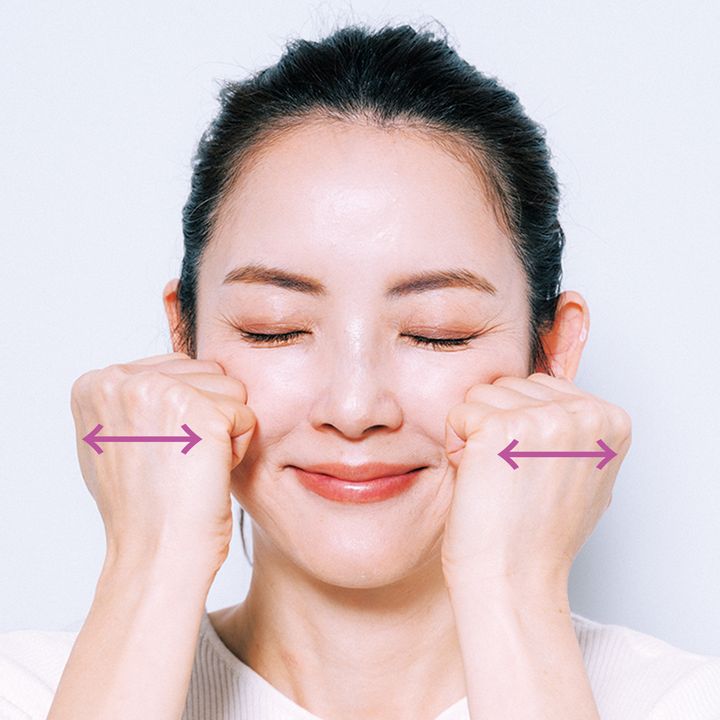 オイルをつけ、小鼻のわきにこぶしを置き頭を少し前に。第一関節と第二関節の間で左右に小さくずらすようにプッシュ。頰全体がほぐれます。